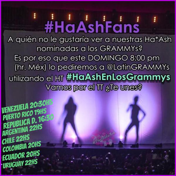 3 horas para empezar a reventar las redes sociales y pedir a #HaAshEnLosGrammys asi que terminen sus tareas!!